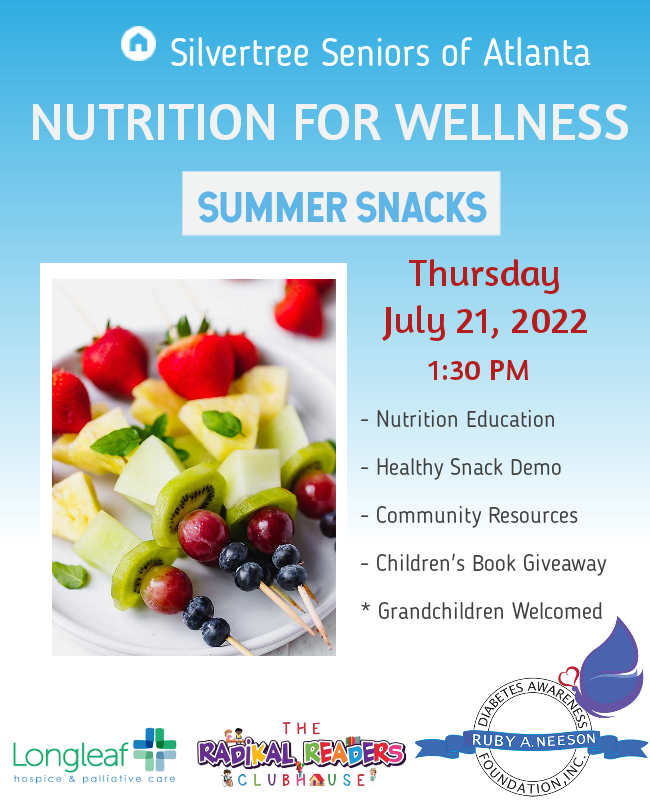 * Thursday, July 21, 2022, Nutrition for Wellness: Summer Healthy Snacks for Grandparents & Grandkids, SilverSeniors of Atlanta *Residents only (Download Flyer) *Children's book giveaway is open to public. Must RSVP!